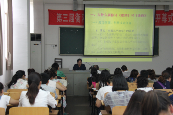 6月29日下午,校纪委书记唐国华在美术楼107教室上了一堂题为“《准则》《条例》解读”的党课。整堂党课内容丰富,例证鲜活,条理清晰,逻辑严密。PA电子总支书记孟宪文、院长叶经文率全体师生党员、部分入党积极分子饶有兴致参与了全程听课。