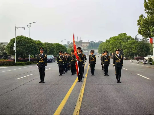 升旗仪式开始,全场肃穆安静。教导队迈着整齐有力的步伐,护送着鲜艳的五星红旗缓缓走向升旗台。他们的步伐整齐划一,每一步都充满了力量与坚定。随着国歌的响起,五星红旗在微风中冉冉升起,宛如一团燃烧的火焰,照亮了整个广场。