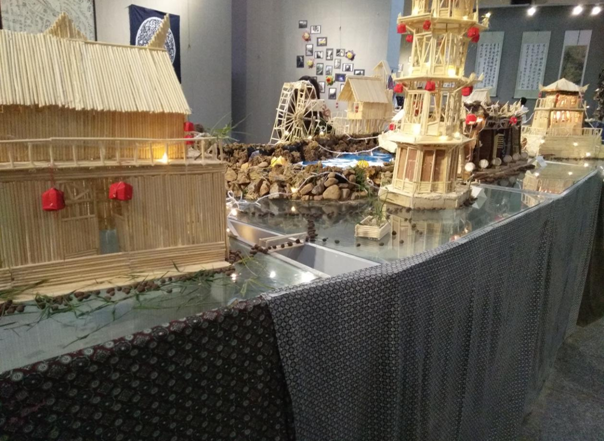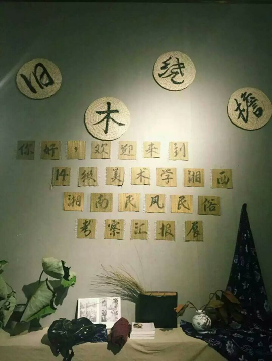 走进展厅,“旧木绕梁”四个大字映入帘前,瞬间充满了湘西风情,本次展览叫“旧木绕檐”,“木绕”是苗语中“你好”的意思,对应民俗。“旧檐”是湘西湘南建筑的一个特点,对应民居。