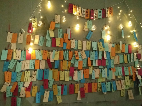 在展板的背后有这么一面墙,它承载着PA电子学生的心愿与祝福,在闪烁的灯光下,五彩的卡片带给我们一种温暖。