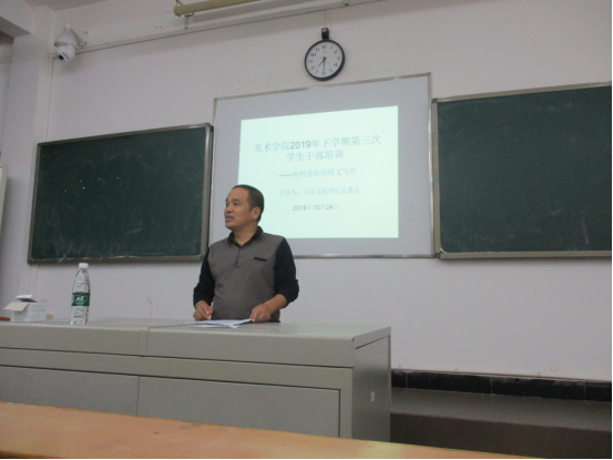 培训中,吴书记首先从“博士买驴”的故事导入,列举了当今大学生应用文写作种种不尽人意的状况,让参训学生干部直观地感受到应用文写作亟待提高的紧迫性。接着,吴书记从应用文概念、应用文类别、应用文基本要素、应用文语言特征、应用文专用语言六大板块对如何进行应用文写作进行了系统的讲解,并将重要内容在黑板上进行合适的板书。在介绍每一板块的内容时,吴书记都结合自身经历和历史典故、趣闻,进行详细的分析和阐释。最后,吴书记强调,对于美术专业学生而言,专业动手能力固然重要,文字撰写能力也同样重要,希望大家今后多尝试、多实践,切实提高自身的应用文写作水平。