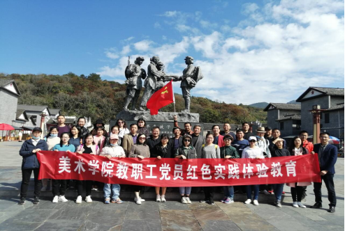 (全体党员同志在沙洲村“半条被子故事”塑像前合影)